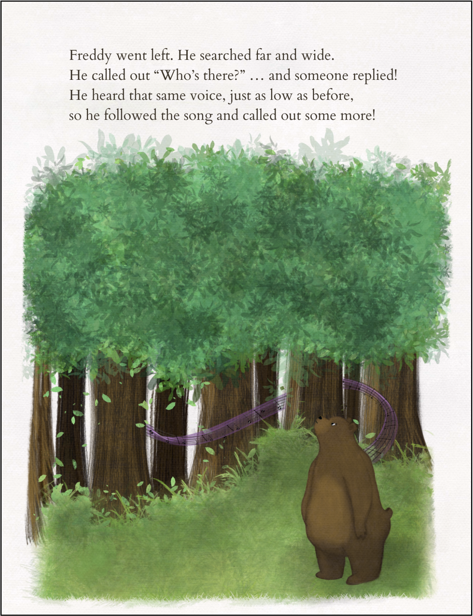 Throughout the books the characters hear or sing music, which is shown in the illustrations on the staff. Click on the buttons below to hear the music from the story!